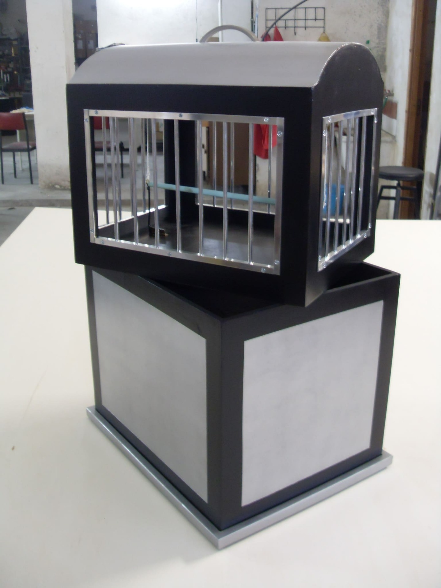 Quattro tortore vengono inserite dentro questa gabbia che a sua volta viene inserita in una scatola ma,tolta la scatola le tortore si saranno trasformate in bellissimo coniglio.