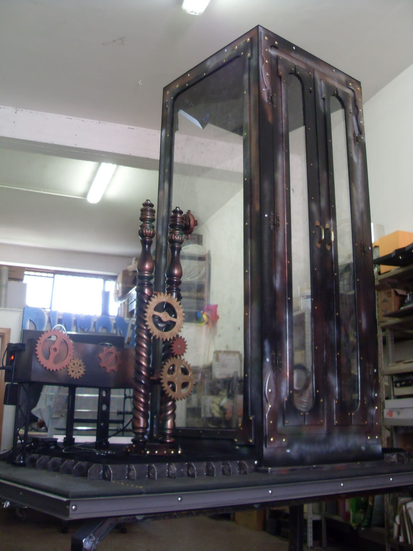 Una cabina trasparente si riempie completamente di fumo quando in un istante il fumo sparisce ed il mago fa la sua apparizione